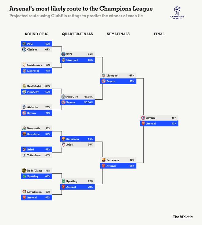阿森纳作为夺冠热门,很大程度上得益于他们作为本届欧冠评分最高球队的地位,但淘汰赛的签位同样对他们有利。基于所有可能的情景和对手的ClubElo评分,阿森纳赢得欧冠的概率为32%,拜仁则以12%位居次席。如果两队在抽签中互换位置,阿森纳的夺冠概率将降至26%,而拜仁的概率将升至17%左右。