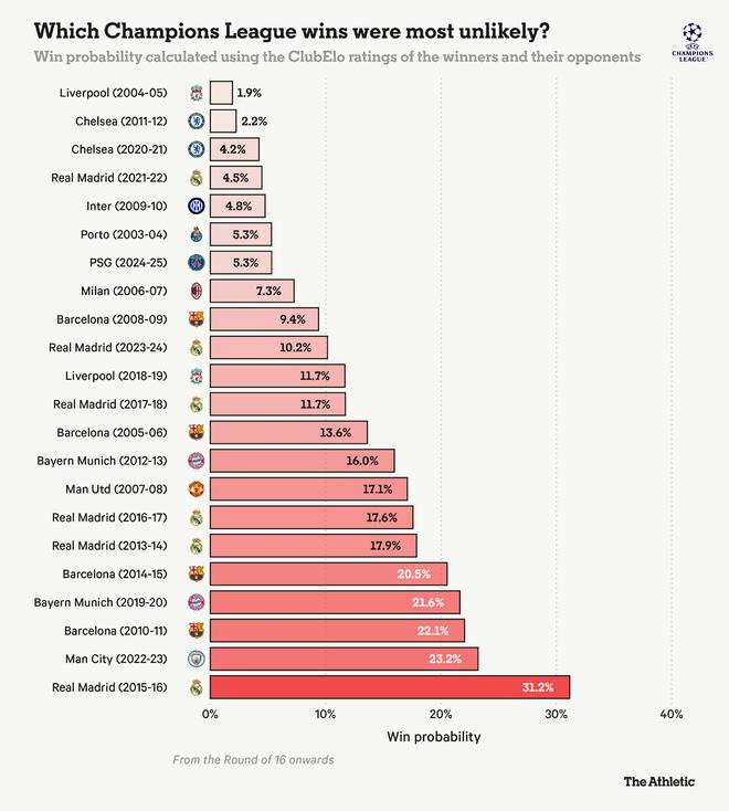 根据他们当时以及对手的ClubElo评分,他们夺冠的概率不到2%。切尔西在2012年的首座欧冠冠军同样出人意料,他们在半决赛和决赛中分别战胜了强大的巴塞罗那和拜仁慕尼黑。
